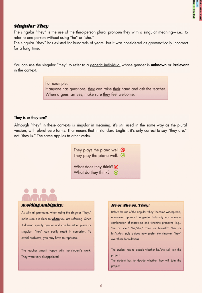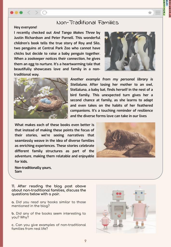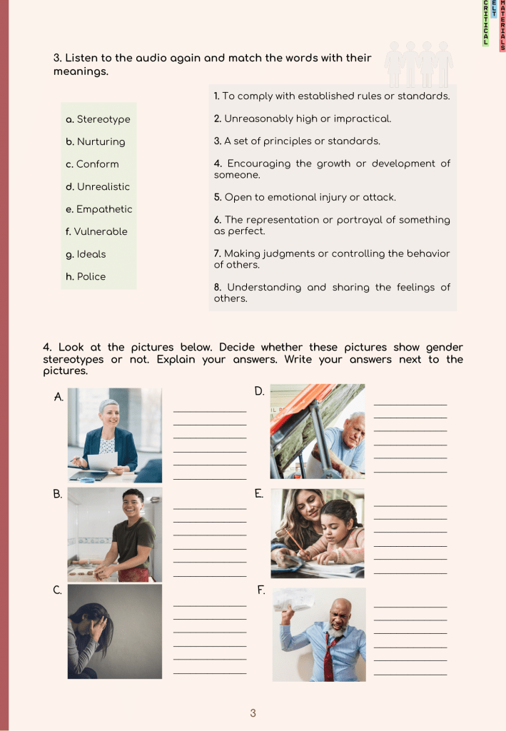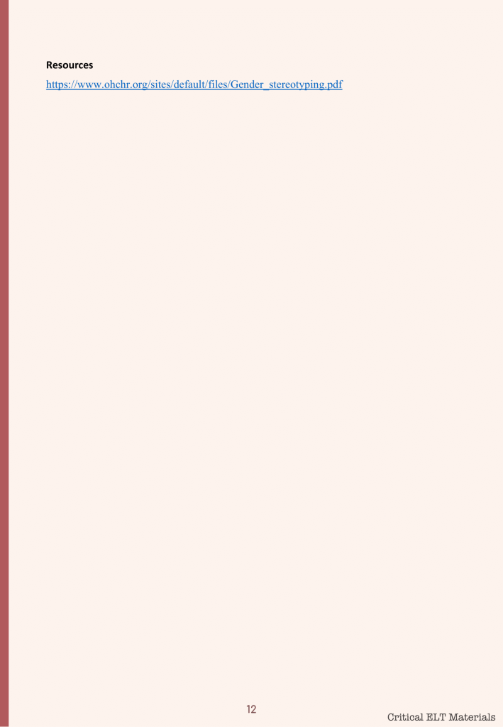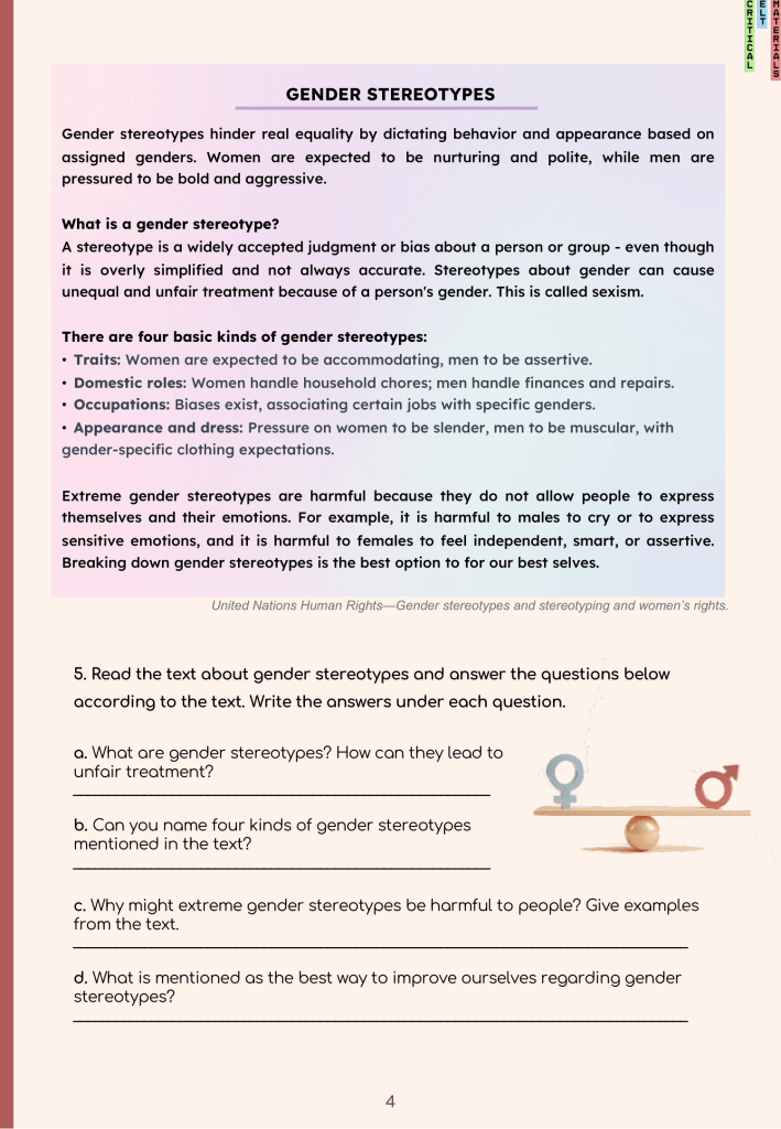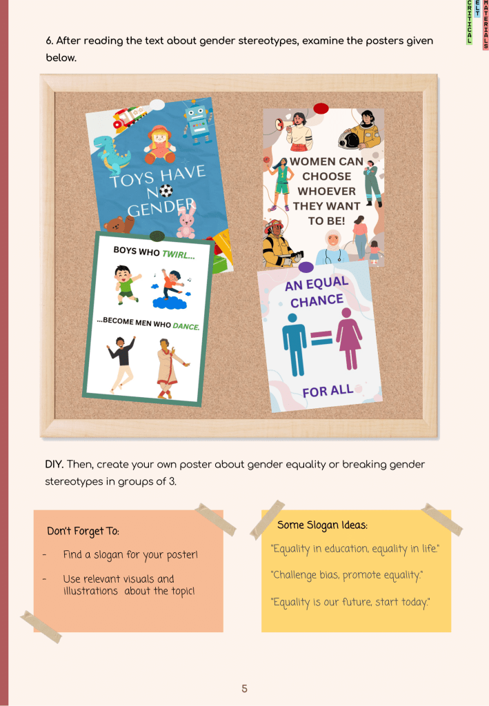 As recent graduates of the Foreign Language Education Department at Middle East Technical University, we had the opportunity to create critical English learning materials under the guidance of our professor, Dr. Yasemin Tezgiden Cakcak. This experience has been incredibly valuable for our personal and professional development. Our material is centered around the idea of gender equality and stereotypes. The main goal of this unit was to make the students aware of the gender stereotypes and inequalities that people face in their daily lives from an early age to adulthood. The unit also includes activities that mention the harms of stereotypes students can face when they are in the workforce, such as pay gaps and tokenism.