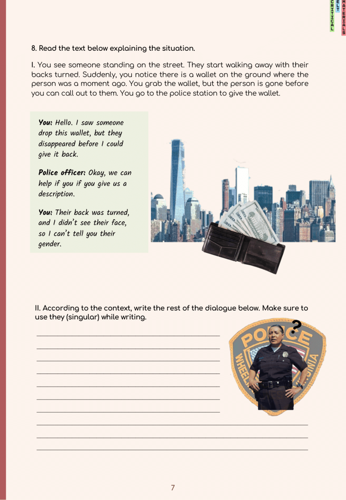 While creating our material, we saw how difficult it was to diverge from our usual ways of thinking, even though we were aware of how biased language could be. It was eye-opening to see just how we considered certain things a given, despite there being no logical reason for it. Why is it considered unusual for a man to cook? Why is it seen as inappropriate for a woman to work as an executive? Why does the idea of a stay-at-home dad feel strange when stay-at-home moms are the norm? And why can’t a little girl play with toy cars? There were a lot of questions we had to answer or, at the very least, put into the activities to make the learners also notice and question the same things. This is why the materials we created not only support language development but also play a vital role in fostering an awareness of stereotypes and identities. Overall, the process was difficult but rewarding. We believe that everyone needs to be aware of our topic, which should be included in every learning material to challenge the stereotypes we all follow without being aware of. Working on the unit highlighted the importance of actively changing our perceptions of gender inequality, proving that starting small can be just as effective.