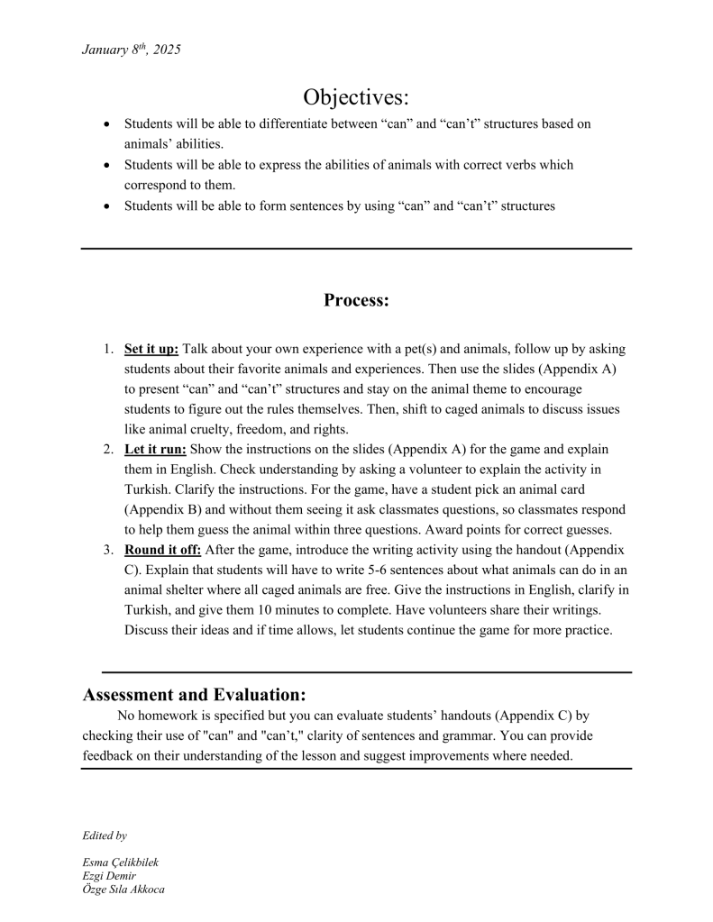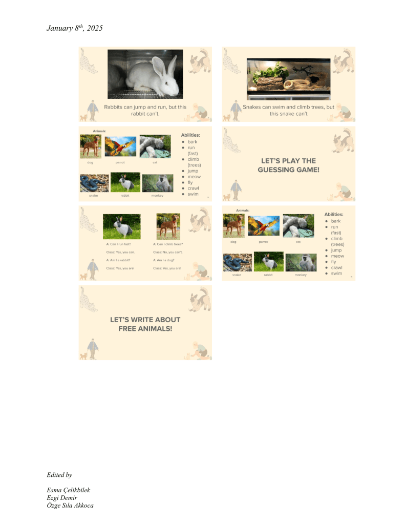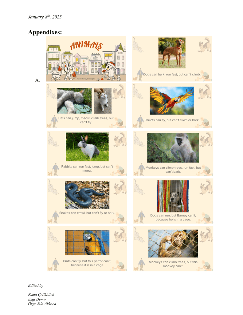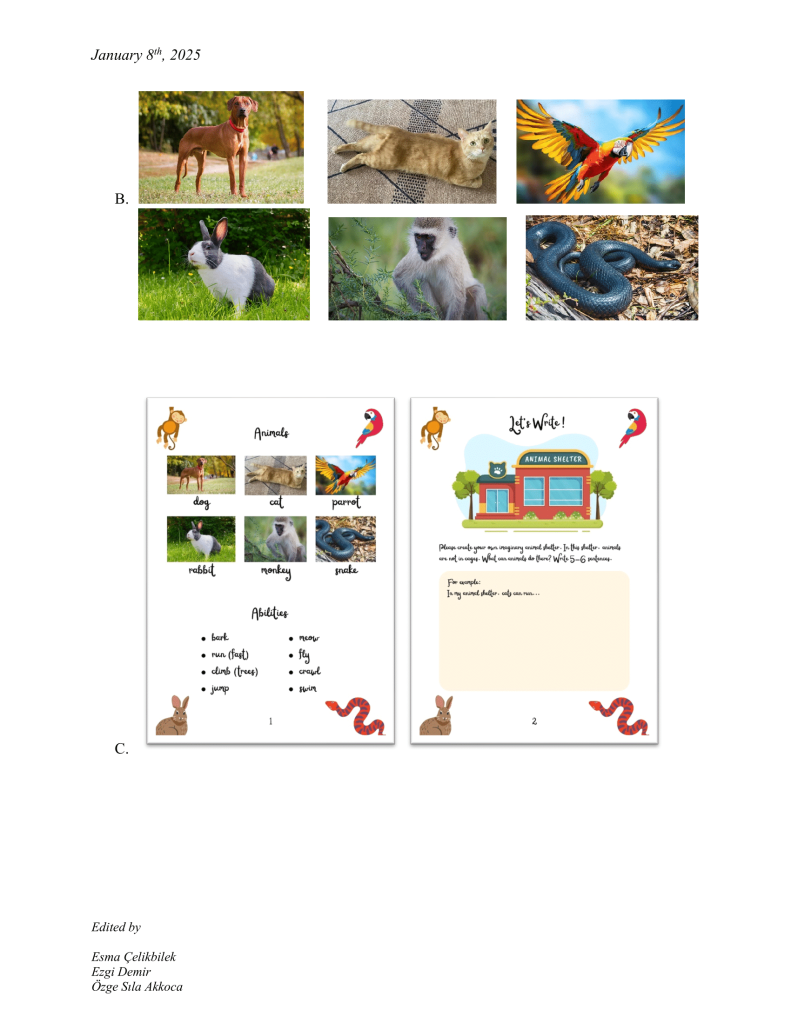 As an animal rights supporter myself, using the critical space ELT provides us was crucial for me to give students some insight or awareness about the issue of animal abuse. They are most of the time overlooked while we let them suffer in silence in the background of our daily lives, which should not be the case. When my group members and I prepared the earlier version of this lesson plan for another course, we had such an agenda in mind. I took it, developed and adapted further for its in-class conduction in the same vein; in hopes that it would estrange students from the daily life where animal abuse is so normalized and put in the front row where we can critically engage with the issue further. When preparing the materials, a hardship I faced was to find images of abused animals that were not too graphic but to the point and appropriate enough to represent animal abuse. Even though, I usually tend not to I had to refer to AI to generate such an image of a dog as most of the pictures I found were too graphic for a 5th-grade in-class display. I asked students to create their own animal shelter in the production part. I thought that having such a responsibility would give them enough sense of a protective ethical relationality to animals when they engage with them. I know that such an agenda is perhaps too grand-scaled to be perpetuated in such a limited space as a 40-minute-long English lesson. However, as a trainee-teacher of English at a state school with relatively limited ability and mobility, this was what I could do to achieve my goal of giving students an opportunity to develop such critical consciousness about the issue of animal abuse.