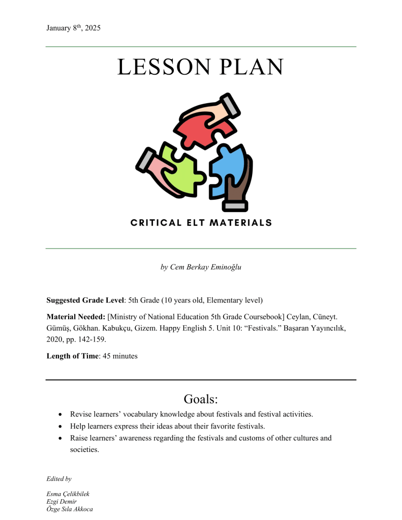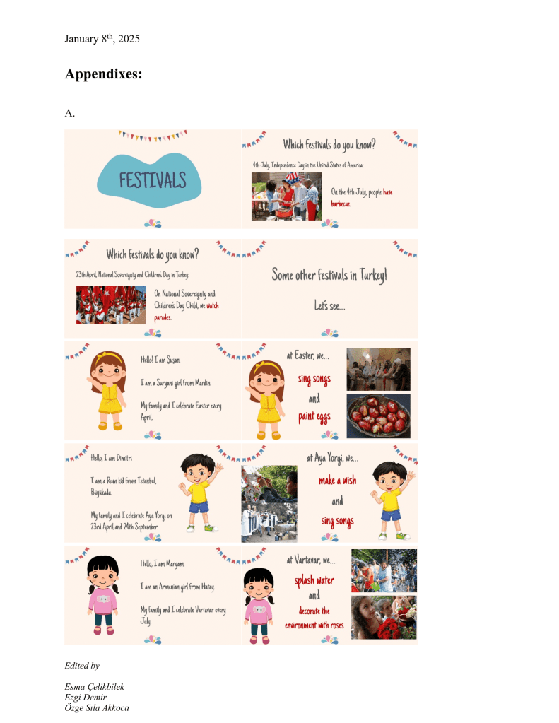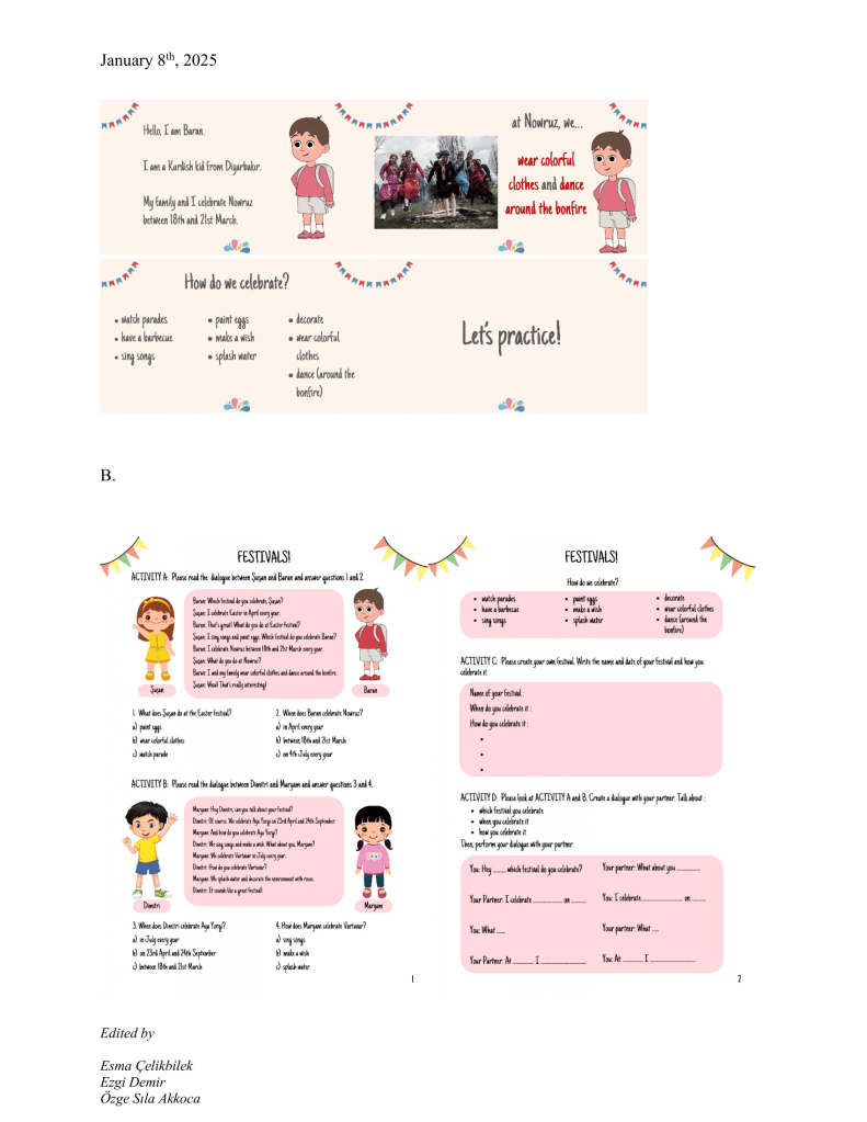 When pedagogic in-class materials are considered, representation has always been a problem. Especially for students of minority groups, the issue pertains even more seriously. Education is just another space where their ethnocultural identity is overlooked. But just because they are under-represented, it does not mean that they disappear. What I wanted to achieve, critically, in this lesson plan, was to bring forth the minority groups through child figures/characters and represent them in educational materials to 1) make students aware of other minority ethnocultural groups with whom they share the same geography, and 2) to make students, if any, who are a part of one of the target minority groups feel more welcomed and safer. The English unit “Festivals” was the perfect opportunity to meet this end as minority ethnocultural groups and their various festivals and festival activities provided me with more than enough material to work with. Why I felt uncomfortable about while preparing the materials was because I risked stereotyping these groups to make them more “recognizable.” Also, there is always the issue of who representing whom; as a person who belongs to none of these groups my representation can easily be seen as misleading, so in order not to under-represent, I think also risked misrepresentation. Despite, all, I think, my attempt can still be regarded as a counter-act to represent the diverse ethno-sociocultural landscape of this geography against the deliberate misrecognition and erasure of such identities that some of the students would have probably been unaware of. Despite such worries, I am glad that I brought the issue up and provided students a space to engage with them critically.