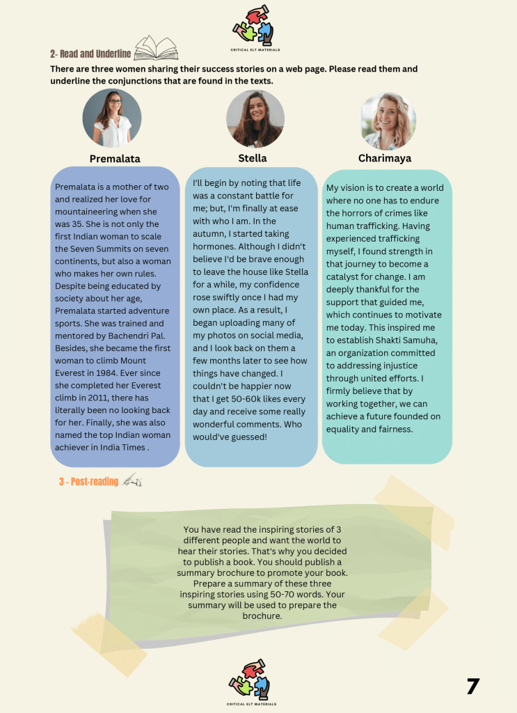Redesigning the ELT material was a really good experience. The process involved thorough research, creative planning, and continuous revisions to ensure the material met pedagogical goals. Our content was also very interesting. Collaborating with my peers allowed me to gain new insights and refine my ideas, highlighting the importance of feedback in material development. One of the key takeaways was learning how to balance language complexity with clarity, ensuring the tasks remained stimulating yet accessible. This experience both strengthened my material design skills and also deepened my understanding of how to address the specific needs of advanced learners.